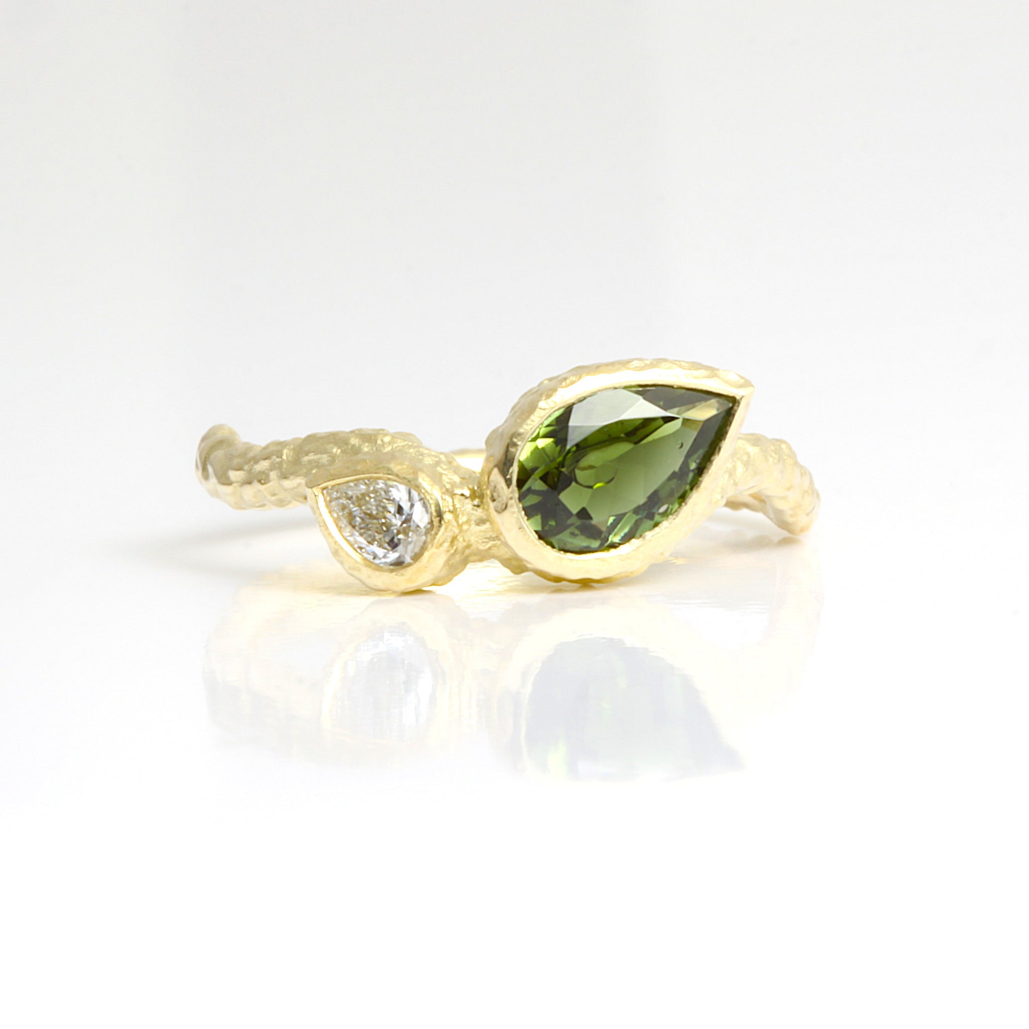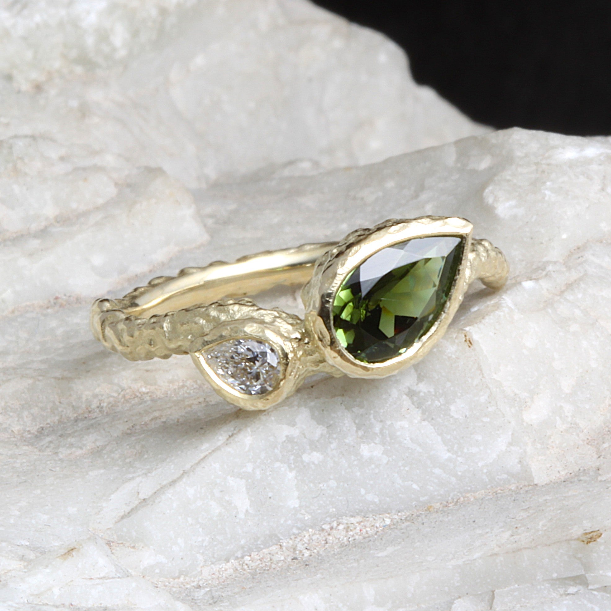 Organic textured Toi et Moi Rocky Ring, made in 14ct yellow gold, and featuring a dark green pear-shaped tourmaline, and a pear-shaped diamond in bezel settings, with a rocky textured band and settings.